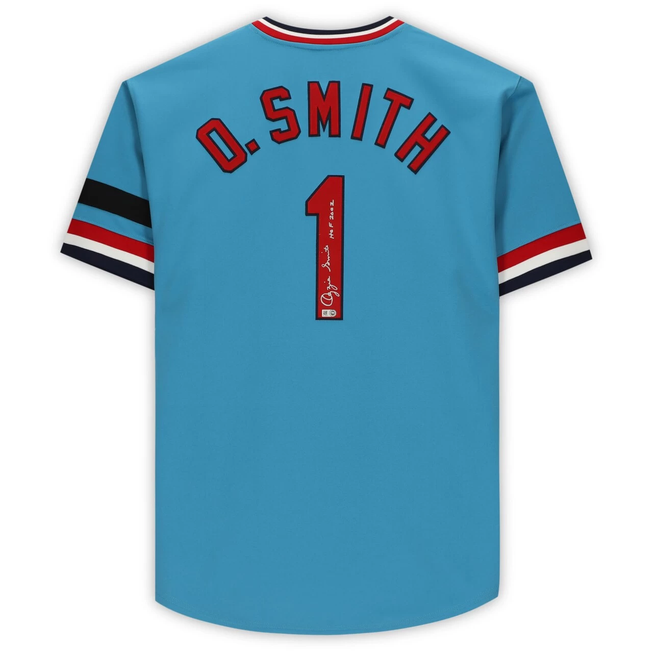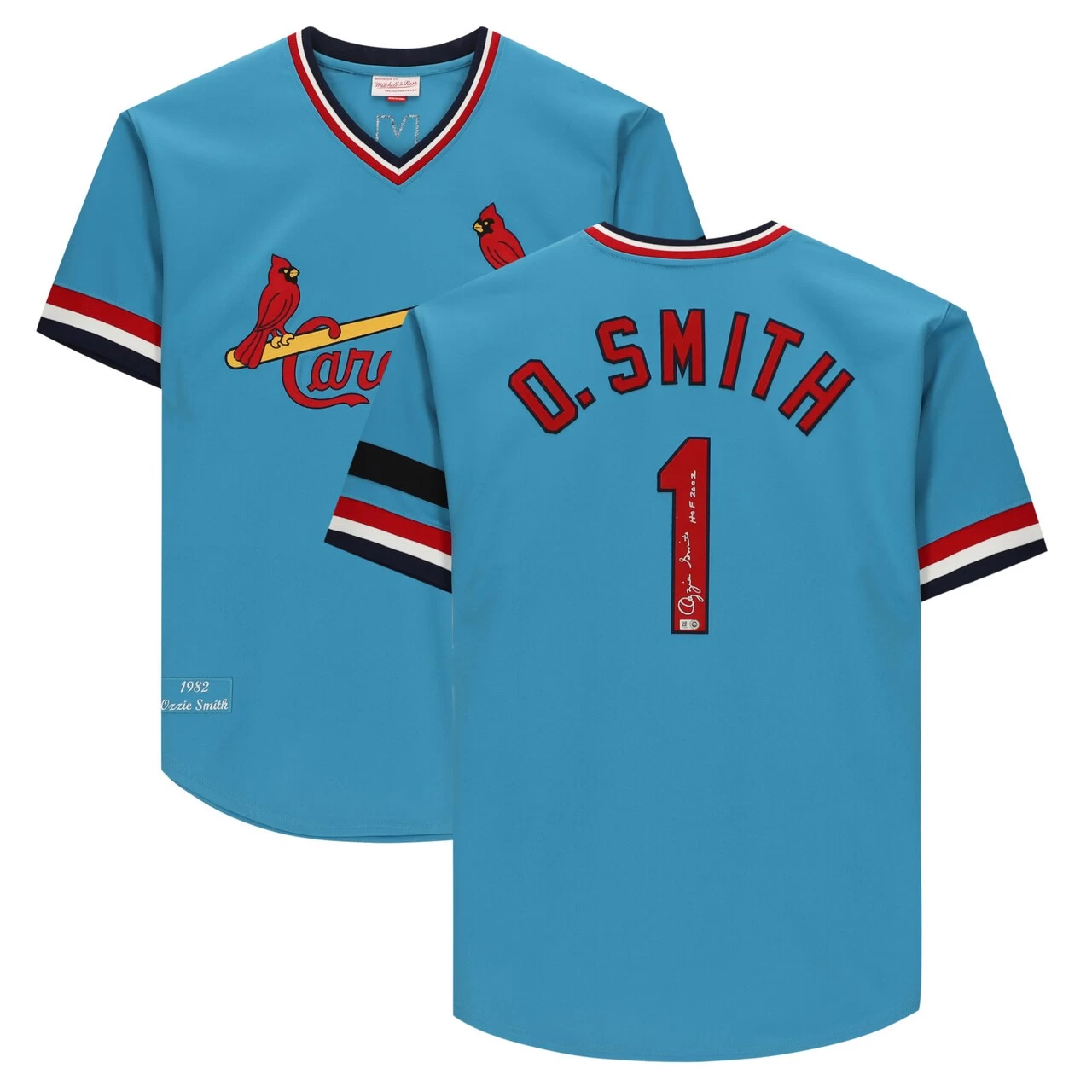 Boost your collection of St. Louis Cardinals memorabilia with this Ozzie Smith Autographed Blue Mitchell & Ness Authentic Jersey with ”HOF 2002” Inscription. Smith started his career off with the San Diego Padres and played with them from 1978-1981, but would later join the Cardinals in 1982, which is where he spent the next 15 years of his career. During his first year with the club, he helped lead them to a Word Series titles, and every year from 1980-1992, Smith won a Gold Glove Award and continuously solidified himself as one of the greatest defensive players of all time. By the end of Smith’s 19-year career, he was a 15x All-Star selection and would be honored with his Baseball Hall of Fame induction in 2002. You can remember his dominant defensive presence by making this hand-signed jersey part of your collection.