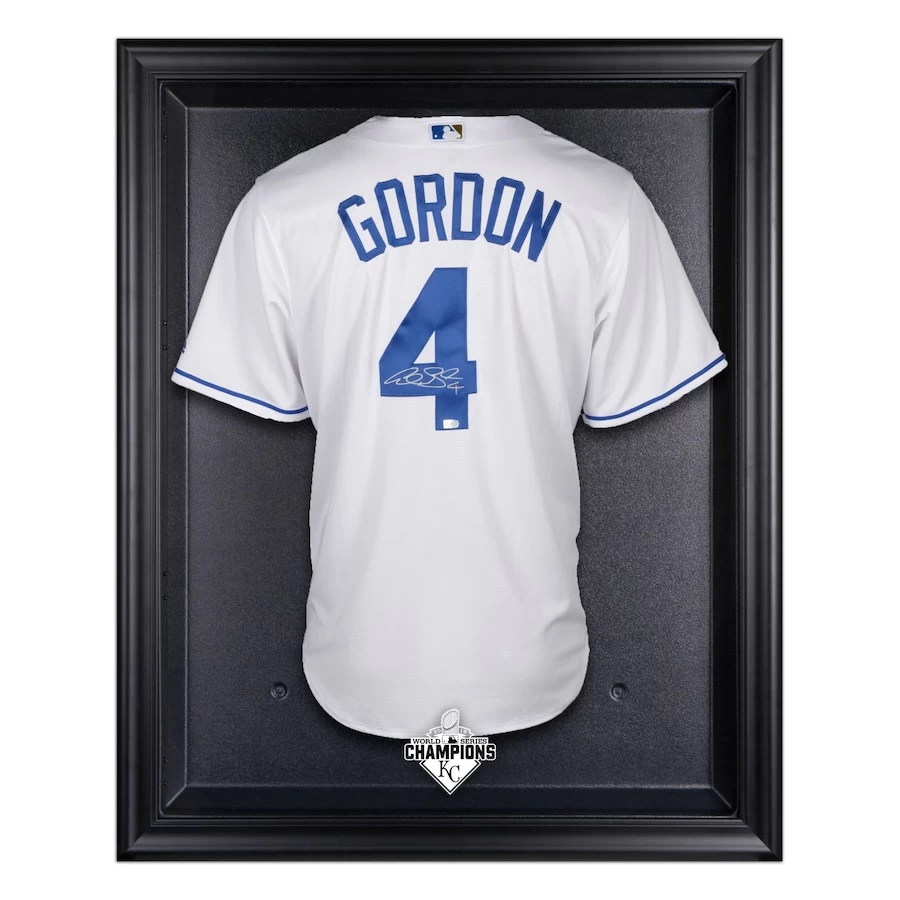 Celebrate the Kansas City Royals as 2015 World Series Champions with this collectible display case. The black framed logo jersey display case opens on hinges and is easily wall mounted. It comes with a 24” clear acrylic rod to display a collectible jersey and is constructed with a durable, high-strength injection mold backing. It comes encased by a wood frame with engraved team logo. It is officially licensed by Major League Baseball. The inner dimensions of the case are 38” x 29 1/2” x 3” with the outer measurements of 42” x 34 1/2” x 3 1/2”. Memorabilia is sold separately.