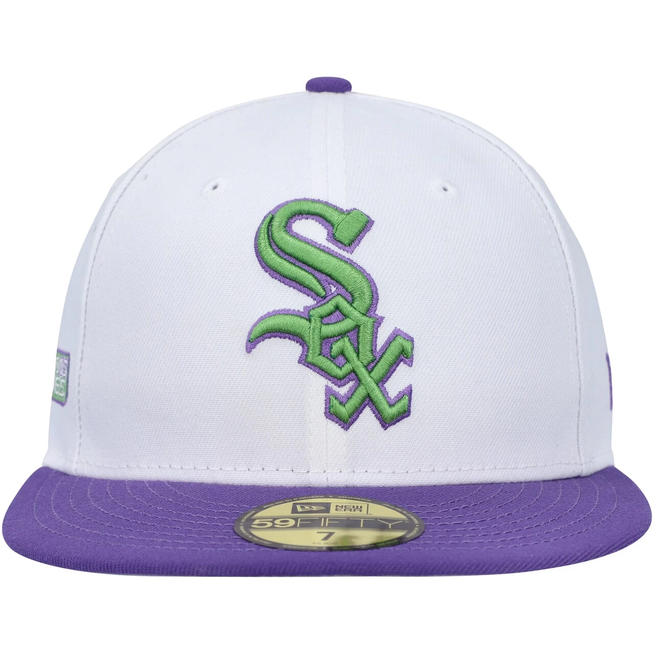 Add a snazzy hat to your lineup of Chicago White Sox gear by grabbing this Side Patch 59FIFTY fitted hat from New Era. The purple and green embroidery pops off the solid white panels for a bold addition to any game day look. The fitted construction provides a consistent wear each time you reach for this cap.